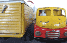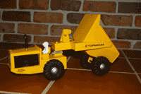 Australian collector John Hams restored the Tourna trucks below. This is what John wrote me: I made the exhaust pipes from two sizes of copper tubing, the engines from pieces of pine and the drivers in the Hopper and Rocker were made from modeling clay and fired in the home oven. Luckily, my old Loader had the original plastic driver for copying. I am really pleased with how they turned out. I still need to touch-up a bit of yellow paint here and there. |