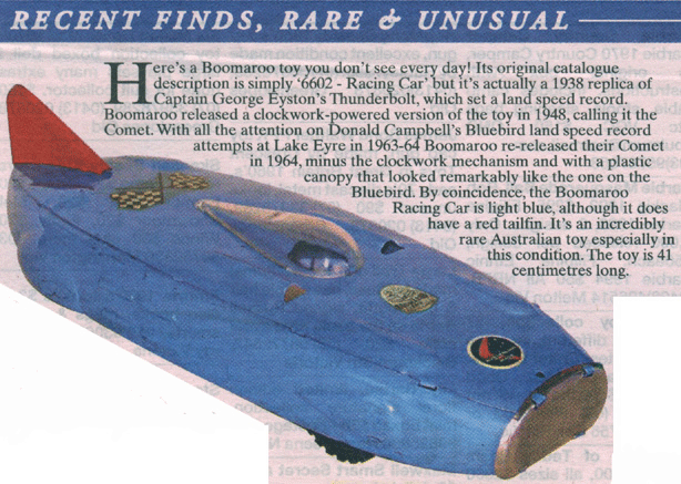 Australian collector Barbara Mihan wrote me this addition: (thank you Barbara) Boomaroo disappeared in the mid 1960s but Wyn was taken over by Hills Industries in 1973 who then no longer pursued the making of toy vehicles. Wyn did make other toy items in the 1960s such as dolly irons and a child's ironing board and pull along toys on wheels for littlest. |