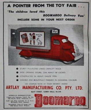 Boomaroo Toys made a range of metal toy vehicles and other toys in competition with other Australian manufacturers such as Wyn-Toys and overseas toy companies such as Buddy-L. They were listed as Boomaroo Products Pty Ltd in Sydney from 1954 to the 1970s. By the mid-1960s they had become associated with Artlay Manufacturing Company Pty Ltd. Boomaroo was a member of The Australian Games Manufacturing Association, TAGMA. |