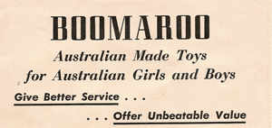 The significance of these Australian-made Boomaroo toys lies not just in their amusing appearance or how the evoke the remembered pleasures of childhood play. They can speak to us about the experience of being an Australian child in the mid-twentieth century, revealing how children are socialised, and how the young became targeted as a consumer market. Most toys mimic the adult world, and looking at them can tell us something about how this world has changed. Changes in technology and the availability raw materials can be traced in the changing methods of toymaking. By 1954, for example, Boomaroo was able to use steel in the manufacture of toys, something that would have been unthinkable ten years earlier during wartime. |