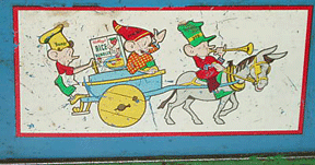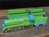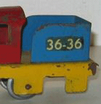 The pictures below and the information came from an American collector Jim O' Clair. Boomaroo made several floor trains as well, I have included pictures of them. I have one of the 36-36 engines. There was also a trolley car similar to the Chein 270 but in the same colors as the 36-36. They are very similar in size to Marx floor trains of the 1930s, in fact the Boomaroo train cars match well to the Marx "LUMAR" floor trains, which are miscategorized as standard gauge. Jim, thank you for your addition! |