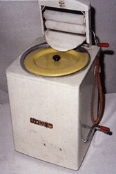 In 1964 Boomaroo introduced a real working washing machine. The first series were rectangular. (27cm high and 18cm square) The second series were round (ø18cm) with various decals Directions for use: Dollies'clothes were put inot the Washing Machine bowl, filled qith warm or hot water. Lux washing flkaes were then added. By turning the handle, the agitator gently washes the clothes. The dirty water was then drained by means of the hose provided, the hose being unclipped and held down below the level of the bowl. Then the hose was clipped back into position when all the water was drained. The clothes should then was put through the wringer and with fresh water in the bowl the clothes were rinsed using the agitator again. A final pass through the wringer and, pesto, the clothes were ready for drying and ironing. |