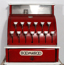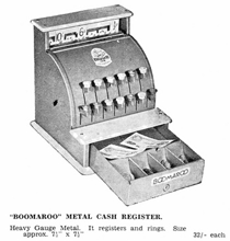 Cash register Around 1964 Boomaroo introduced a Cash register in various colours. It has a positive automatic operation - after pressing any key, a bell rings - price registers - and the drawer opens. The register was supplied with Notes, Matel money and a locking key. A second generation Cash register was a decimal conversion model.