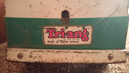 Tri-ang Series In South Africa (3) February 2013 I received an email from Brian Brown, who lives in Pretoria South Africa: I came across your web site which I thoroughly enjoyed reading especially the info regarding Triang in SA. I had absolutely no idea that the products were manufactured here albeit very few and not to the same standard as in England. It made me scratch in the attic as I remembered a broken(hand me down) toy my late father gave me as a very young child in the 1960's. I always kept it and really played with it with great love and appreciation as toys were not easy to come by given the circumstances(apartheid)I was raised in. Brian's Van This toy was the envy of the other kids in my street because the front wheels could steer.The wheels were played right off the toy, and at the age of 13 when I got hold of bits and pieces of Meccano I put together wheel sets for the toy. I put it away and basically forgot about it until now. It is in a very bad way rust wise but the words " Triang Delivery" still stands proudly on the sides of the model. If this is SA made I will certainly be in possession of some great history.Hope you can shed some light on this toy. In 1938 Tri-ang introduced a Motor Delivery Van (No 103/4)