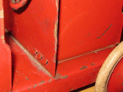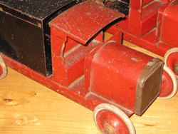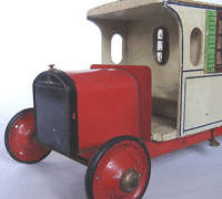 A massive truck with steel chassis; black enamelled bonnet and cab in red witha back door to open. The steel disc wheels have real Dunlop solid rubber tyres. Domed mudguards.