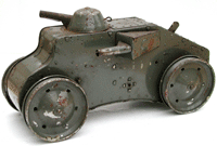 Swivelling gun turret on top has spring handle to fire the gun. Gun turrets at sides. Clockwork motor with start and stop lever.