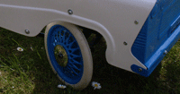 The front and rear panels were re-attached using pop rivets as they were originally and the pedals were bolted back in place using new bolts, a reproduction Mobo steering wheel was made using a Reproduction Tri-ang wheel with a horn ring added, the wheels was then painted non original grey as white didn't suit the car, stick on chrome trim was added to the ring and the centre of the wheel to look more like a real car wheel. |
