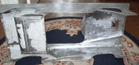 Please carefully follow the instructions on how to use the paint stripped, it will do metal no damage but it will to other materials as it is very corrosive.! The car has now had the paint stripped off been treated with Genolite rust remover, it was then thoroughly sanded to get really clean metal. The rivets holding the front and rear panels on have been drilled out and the axles and pedals and rods etc removed and put to one side to work on later. The dent and greases have been knocked out as flat as possible to reduce filling. The car was a lot worse underneath than first thought so a the rusty areas have been cleaned back with a power file/sander and treated with Genolite, the rest of the paint underneath is sound and will be sanded and primed. |